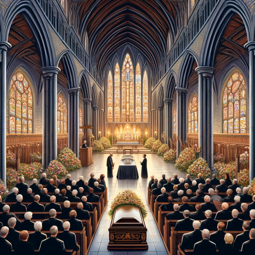 The funeral was held in a large cathedral with many attendees.