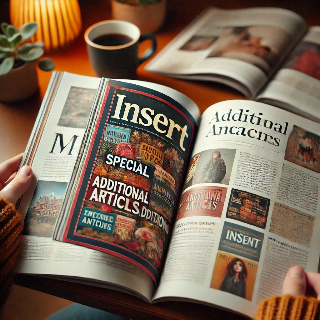 - Example: "The magazine came with a special insert featuring additional articles."