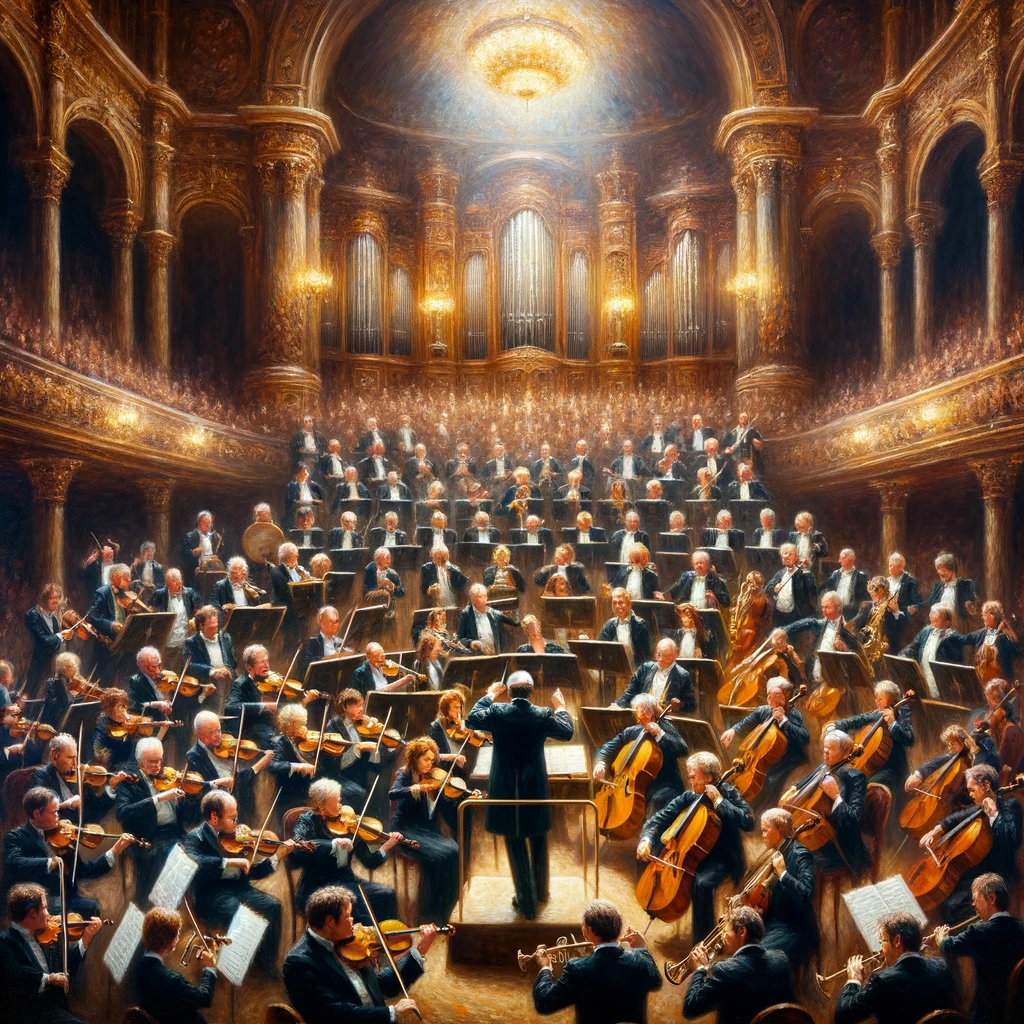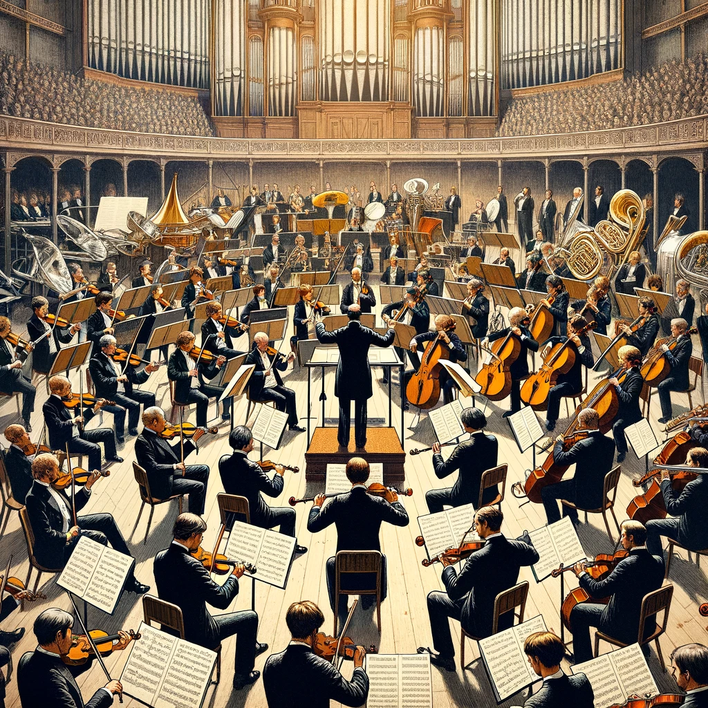 - Large Ensemble of Musicians: A sizable group of musicians playing various instruments together, often led by a conductor. It can include a combination of string, wind, brass, and percussion instruments.