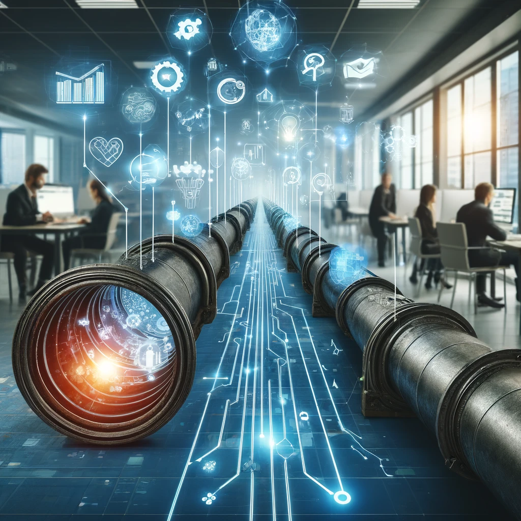 Pipeline typically refers to a long tube or series of connected tubes, often underground, for transporting oil, gas, water, etc. over long distances. In a broader context, it can also denote a channel or process in place for the development and progress of certain tasks or projects.
